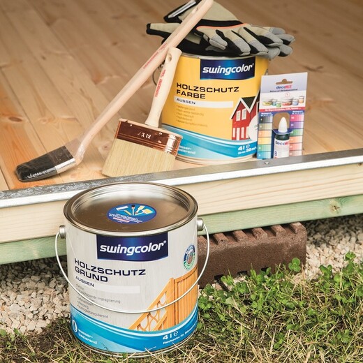 Jedes Holz im Garten braucht zusätzlich einen chemischen Schutz. Ganz grob hat man die Wahl zwischen Holzöl zum Schutz vor dem Vergrauen, Lack zur Versiegelung der Oberfläche, pigmentierter Lasur, die Farbe bringt, aber die Holzstruktur sichtbar lässt und der Holzschutzfarbe mit ihrer dichten, bunten Farbschicht.