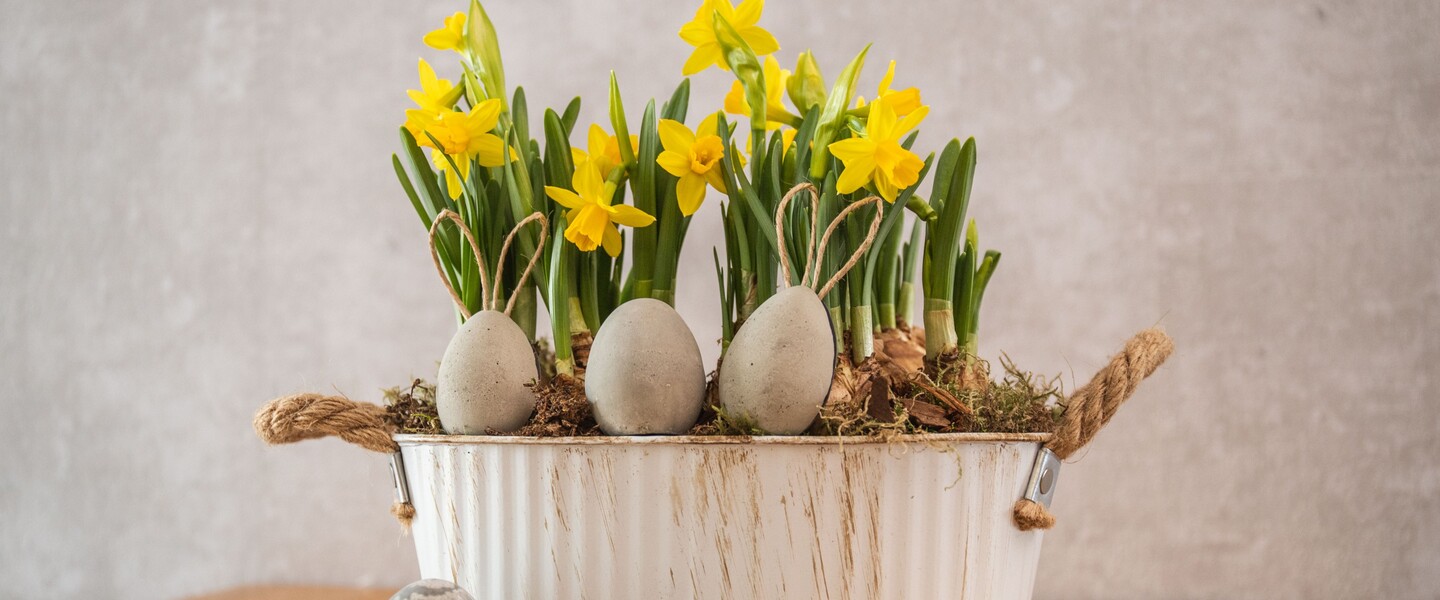 Du hast es geschafft: Deine Betoneier sind fertig und können nun dekoriert werden, z.B. in einer schönen Schale mit Osterglocken.