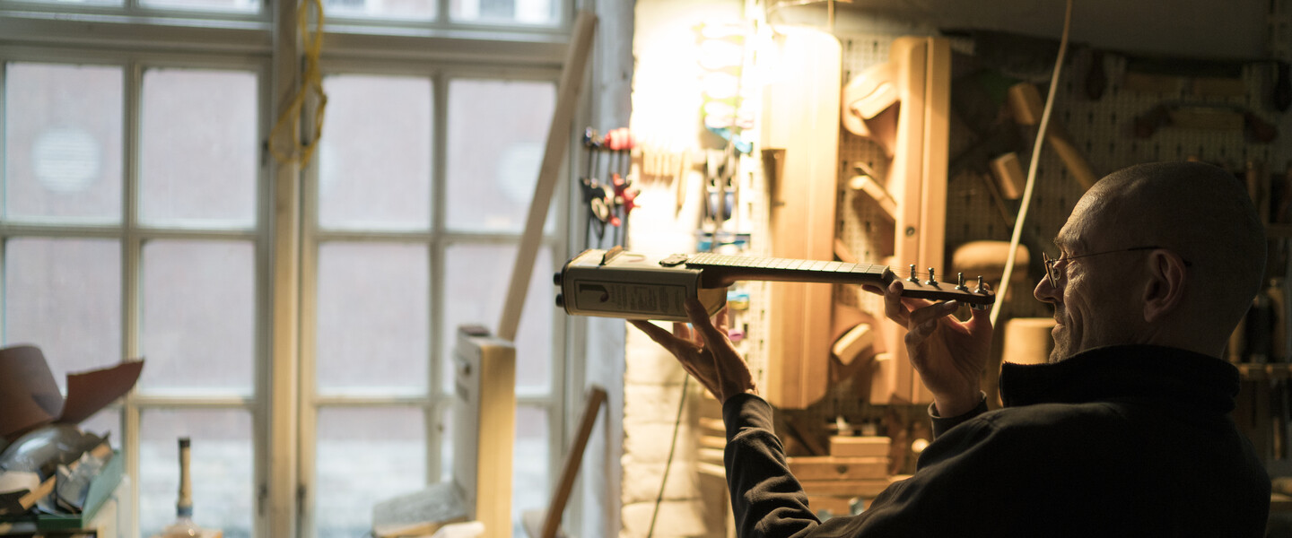 Heute plant er seine Saiteninstrumente akribisch am Computer, tüftelt am perfekten Klang und baut die Instrumente schließlich aus Holz, Dosen und anderen Materialien in seiner Hamburger Werkstatt.