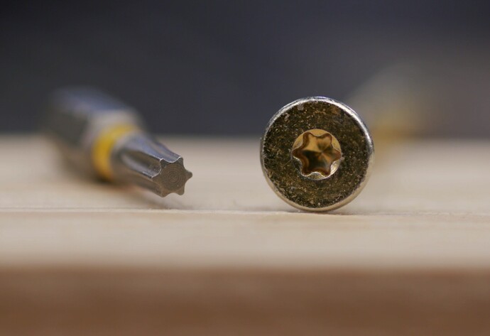 Die smarte Schraube. Stand der Technik. Hat innen eine runde Aufnahme mit sechs Flanken. Heißt deswegen offiziell „Sechsrund“. Der Akkuschrauber muss nicht gedrückt werden, um sich im Schraubenkopf zu verzahnen. Sehr gut, um hohe Drehmomente zu übertragen. Abkürzung „TX“. Der Kopf braucht etwas Platz, deswegen selten für Schrauben unter 3 mm im Einsatz. Ist inzwischen auch im Maschinenbau, bei Autos und Motorrädern Standard.