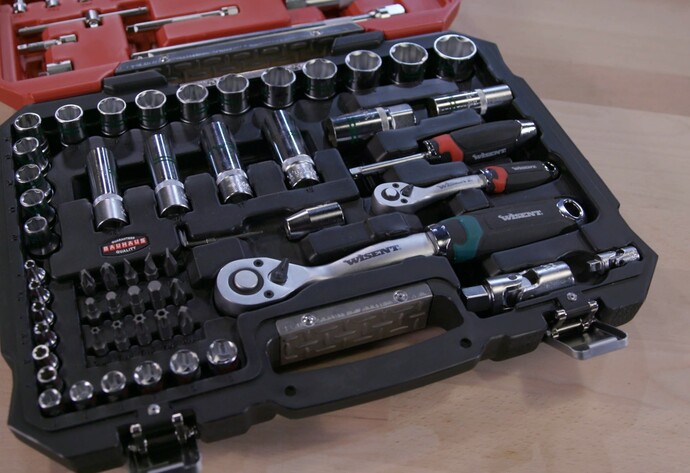 Baukasten für Mechaniker. Freilaufratsche („Knarre“), Kardangelenk, Steckschlüssel und Verlängerungen für eine Vielzahl von „Nüssen“, also Steckschlüsseleinsätzen. Drei gängige Größenklassen: 1/4 Zoll (leicht), 3/8 Zoll (Mittelklasse), 1/2 Zoll (schwer).