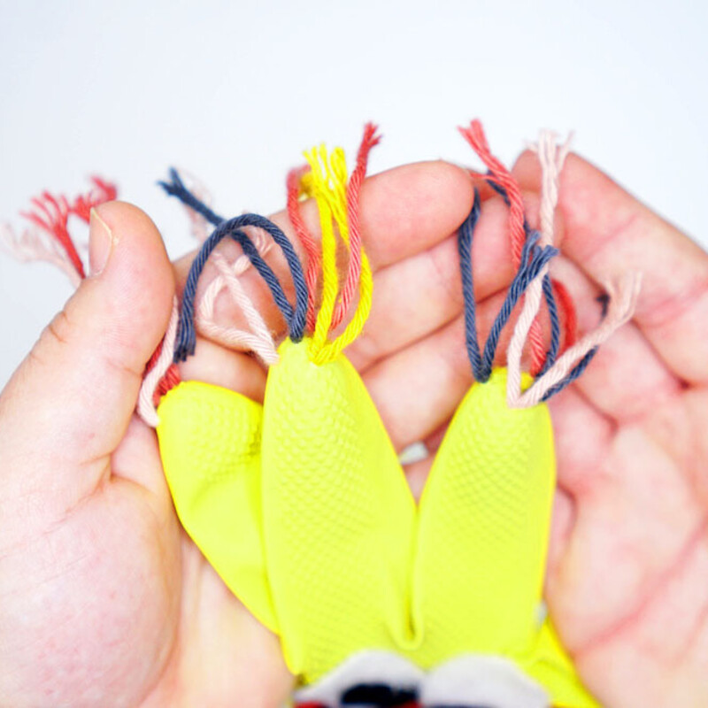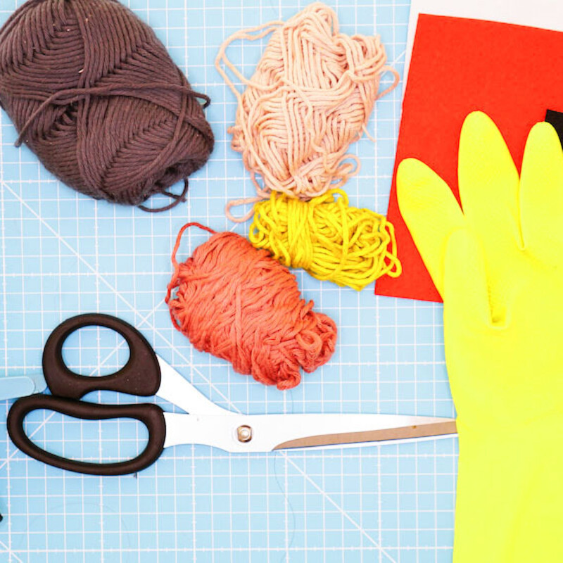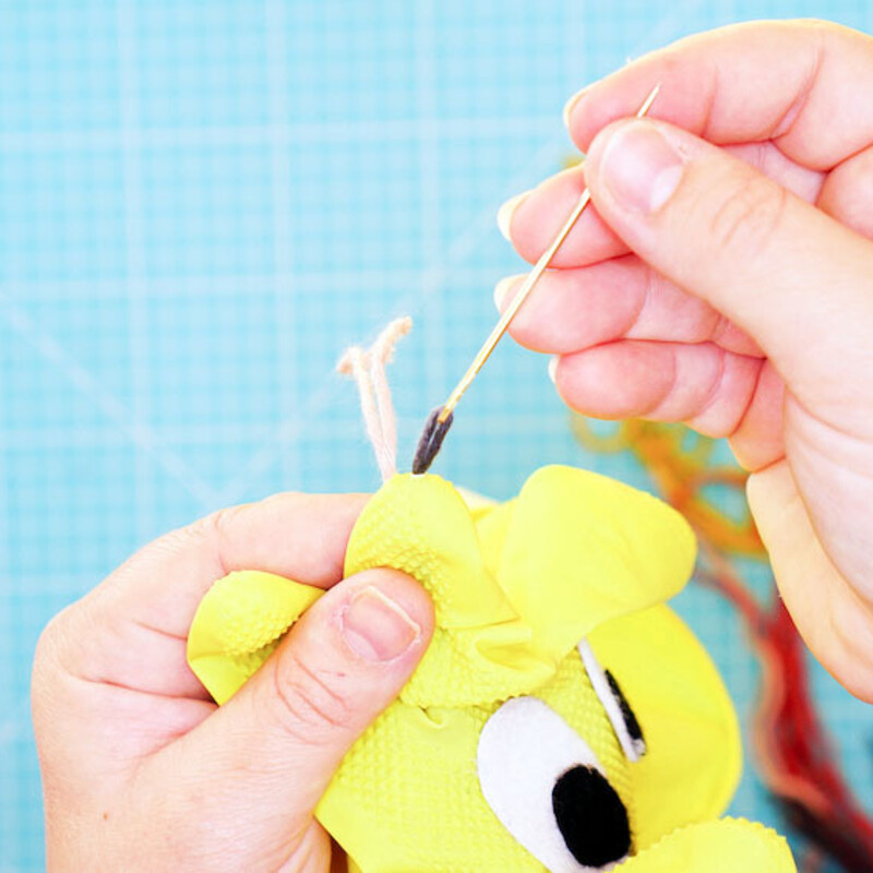 Im letzten Schritt kannst Du mit Nadeln und Wolle tolle Haare für die Handpuppe gestalten. Fädle einfach mit der Nadel Wollfäden von der Innenseite des Handschuhs nach außen und verknote anschließend die Fäden auf beiden Seiten. Mit genügend Wollfäden lassen sich tolle Frisuren gestalten.