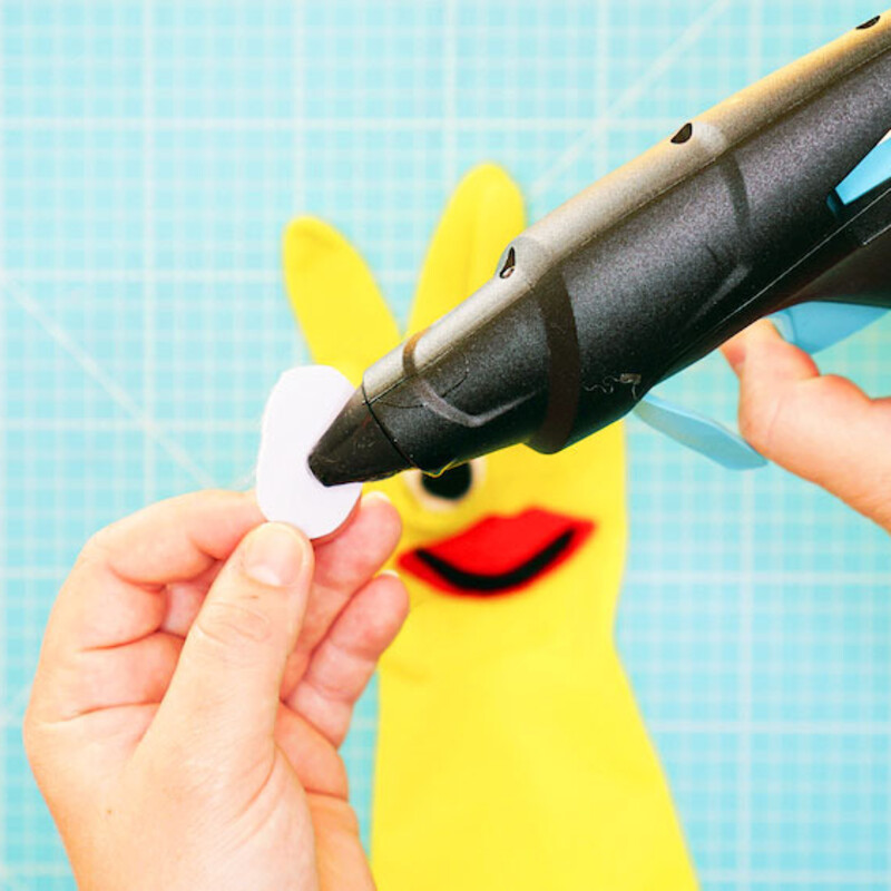 Klebe nun die einzelnen Teile des Gesichts auf den Handschuh auf. Am besten eignet sich dafür eine Heißklebepistole. Wenn Du keine Heißklebepistole hast, kannst Du auch einen handelsüblichen Alleskleber verwenden.